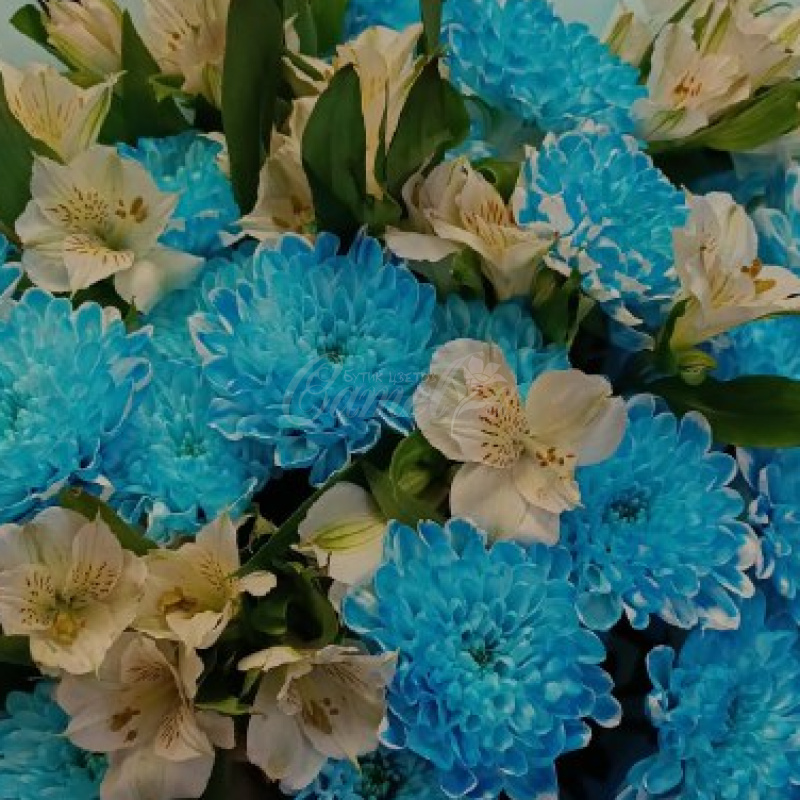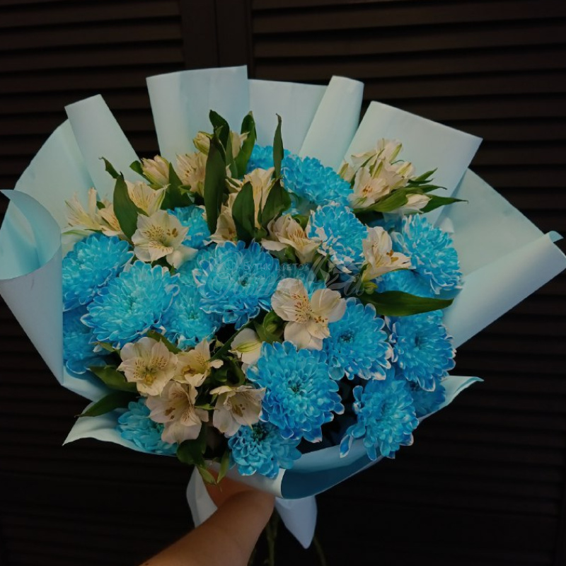 Изящный букет, в котором сочетаются прохладная утончённость голубых хризантем и нежная чистота белой альстромерии. Эта композиция воплощает спокойствие, свежесть и изысканную элегантность — идеальный выбор для тех, кто ценит нетривиальные цветовые решения и природную красоту.