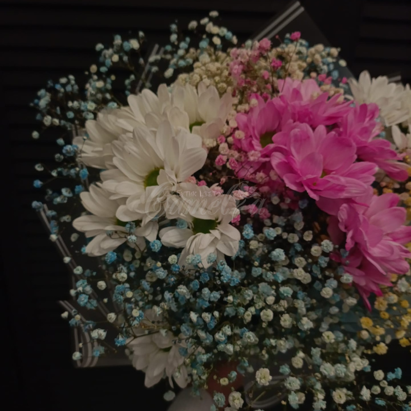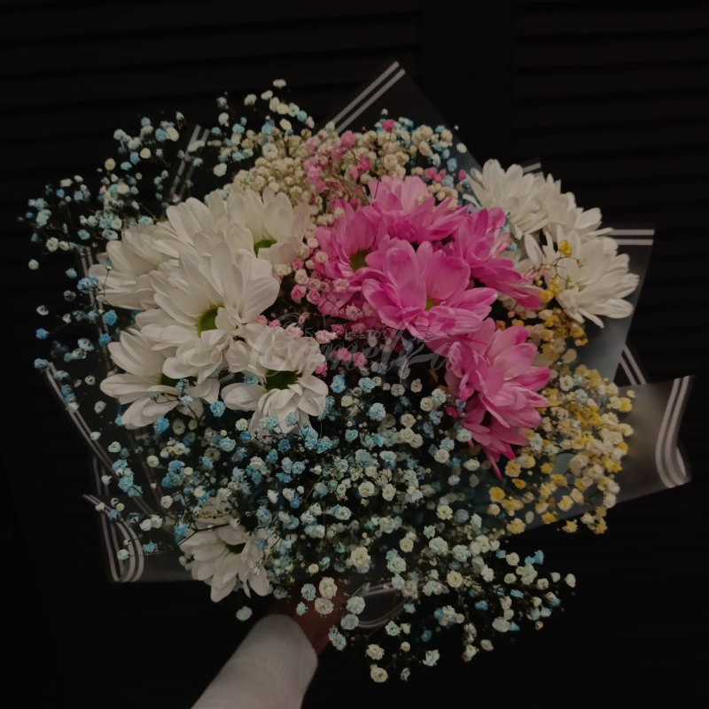 Воздушные цветы гипсофила, и долгостойкая хризантема кустовая в упаковке. Воздушный и нежный букет,который можно подарить по любому поводу.