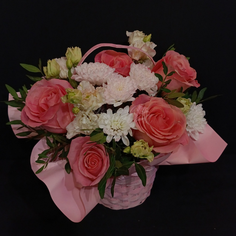 Изящная цветочная композиция в плетёной корзинке — трогательный подарок, который передаёт теплоту ваших чувств. Нежно‑коралловые розы создают мягкое, романтичное настроение и становятся центром этой утончённой аранжировки.